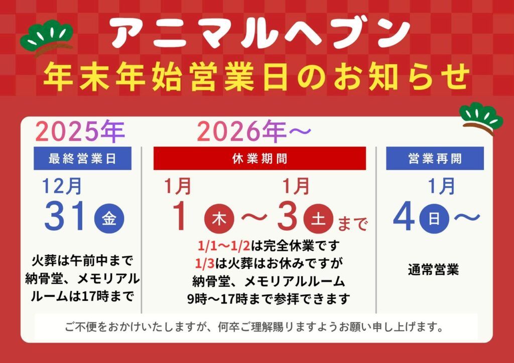 2026年 年末年始の休業日のお知らせ
